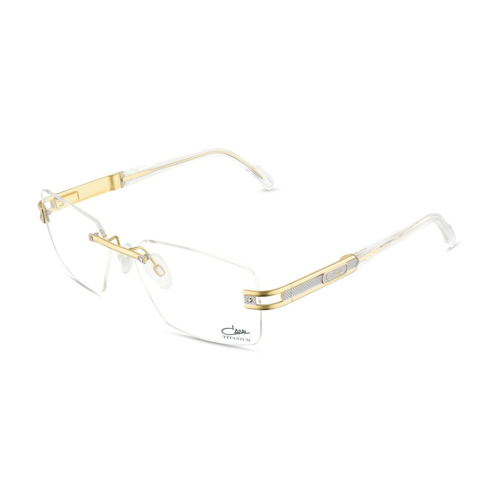 ダブルヒンジを採用した力強いテンプルは、シンプルに傾きがちなリムレスデザインに、カザールらしい個性と重厚感をプラスします。