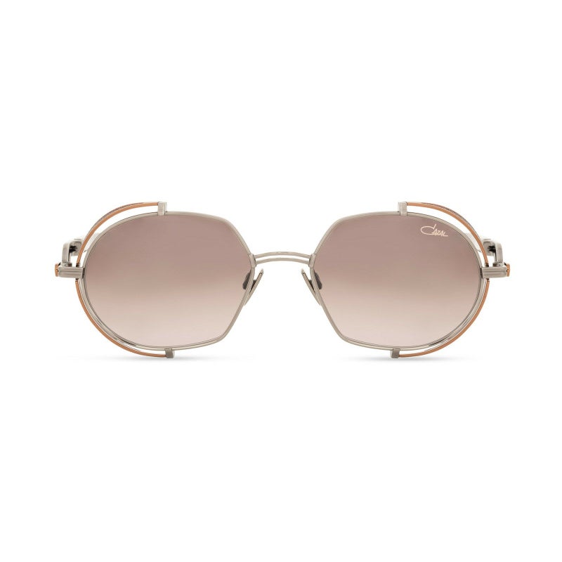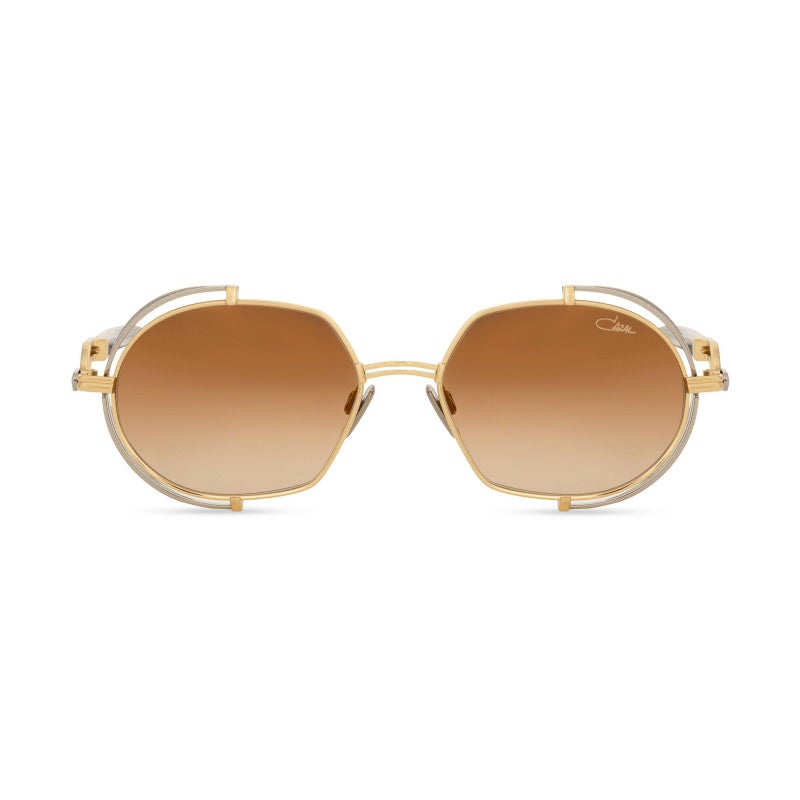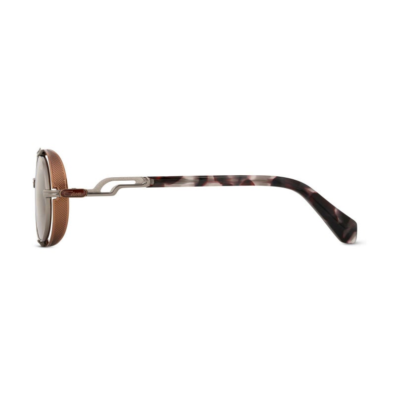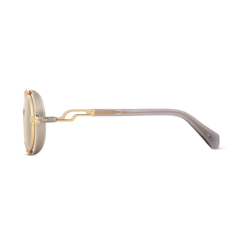 クラシックな雰囲気と未来的な要素が融合した、レトロフューチャーな魅力あふれるラウンドシェイプのサングラス。柔らかな丸みを帯びたレンズに、サイドの立体的なメタルパーツが個性を添え、上品さと存在感を両立しています。テンプルにはカザールらしいシグネチャーデザインが施され、横顔にも華やかさをプラス。軽量なチタンフレームが快適な装着感を支え、日常から特別なシーンまで活躍する一本です。シンプルながらもスタイルにアクセントを加える、独自の存在感を放つアイウェアです。